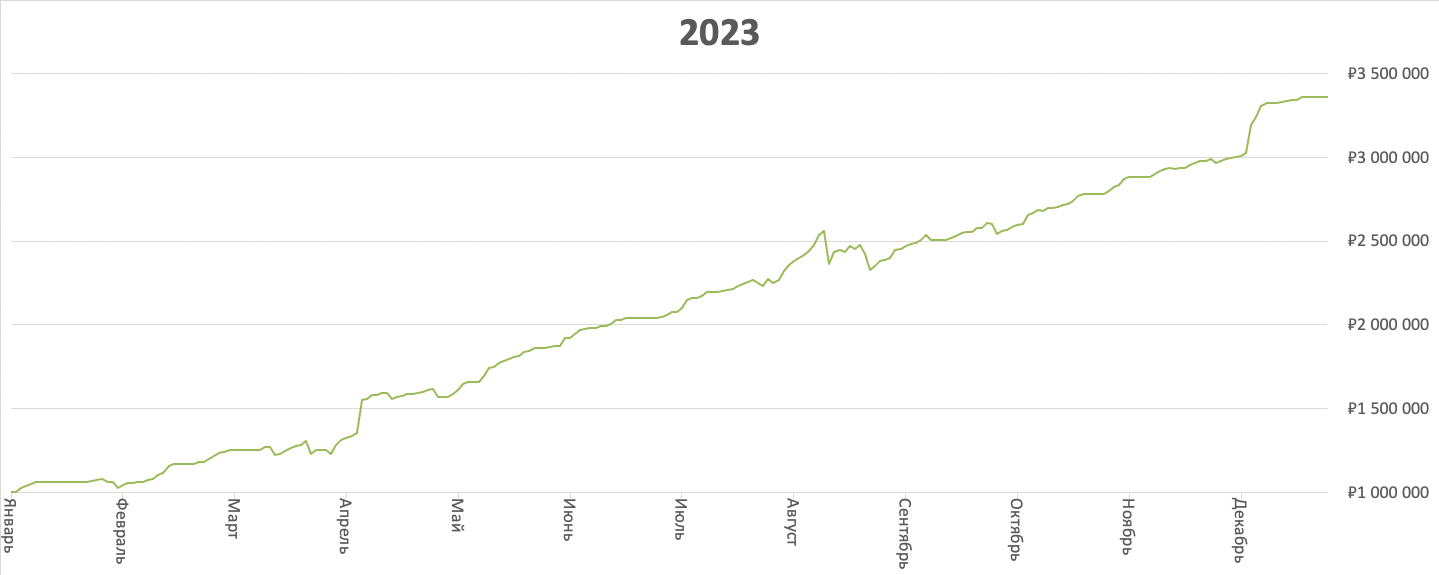 График роста капитала 2023 Капитал вырос с 1 млн до ~3,4 млн ₽. В августе была заметная просадка, после которой последовало уверенное восстановление и резкий рост в декабре. График показывает устойчивость торговой системы даже в моменты волатильности.
