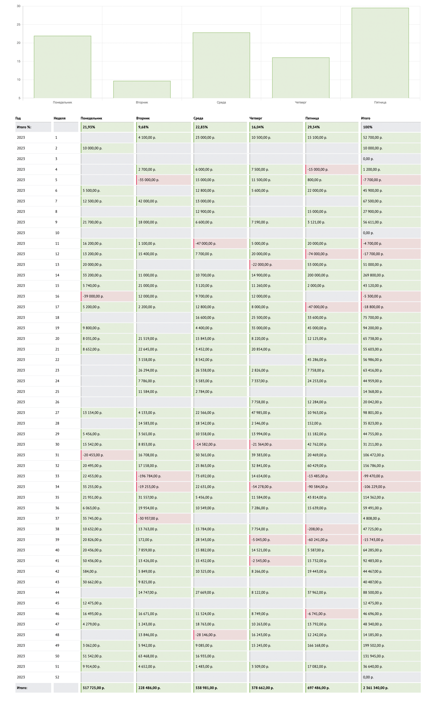 Таблица торговых результатов Показывает прибыль и убыток по каждой неделе года с разбивкой по дням — понедельник, вторник, среда, четверг, пятница. Зелёные ячейки — прибыльные дни, красные — убыточные. Лидер года — пятница (29,54%). Итог года: 2 561 340 ₽.
