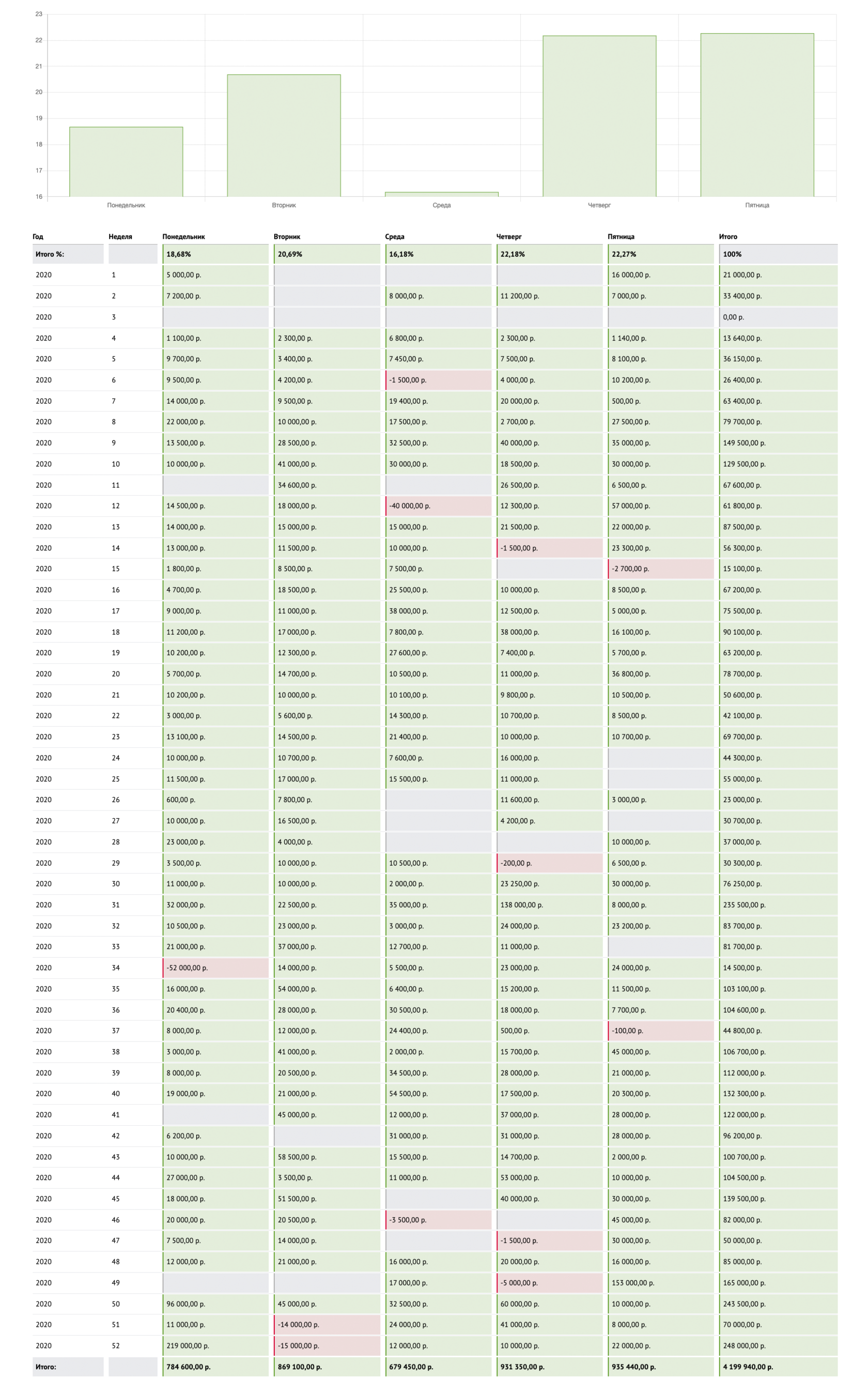 Таблица торговых результатов Показывает прибыль и убыток по каждой неделе года с разбивкой по дням — понедельник, вторник, среда, четверг, пятница. Зелёные ячейки — прибыльные дни, красные — убыточные. Лидер года — пятница (22,27%). Итог года: 4 199 940 ₽.