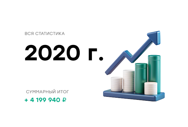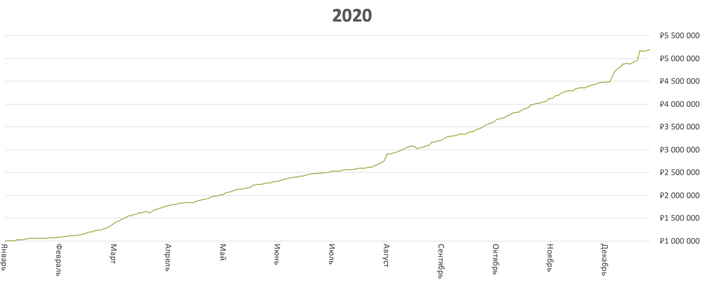 График роста капитала 2020 Несмотря на то что 2020 год был одним из самых турбулентных в истории рынков, капитал вырос с 1 млн до ~5,3 млн ₽. Рост шёл стабильно весь год с резким ускорением в декабре. Один из лучших годов по абсолютному результату.