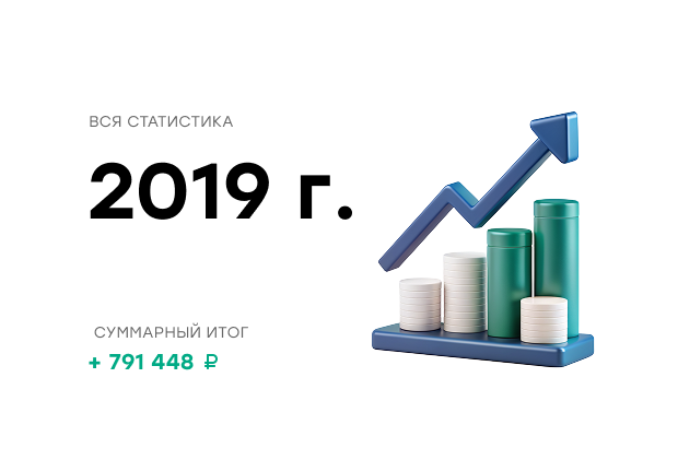 График роста капитала 2019 Один из самых стабильных годов — кривая роста почти без просадок, уверенно вверх весь год. Капитал вырос с 1 млн до ~1,8 млн ₽. График показывает стабильную и системную торговлю без резких движений.
